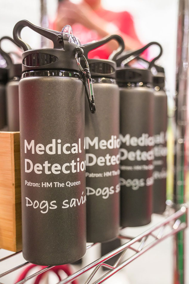 Branded Medical Detection Dogs metal water bottle with screw lid and lift straw plus handy clip that will secure your bottle to a belt or bag or bike.